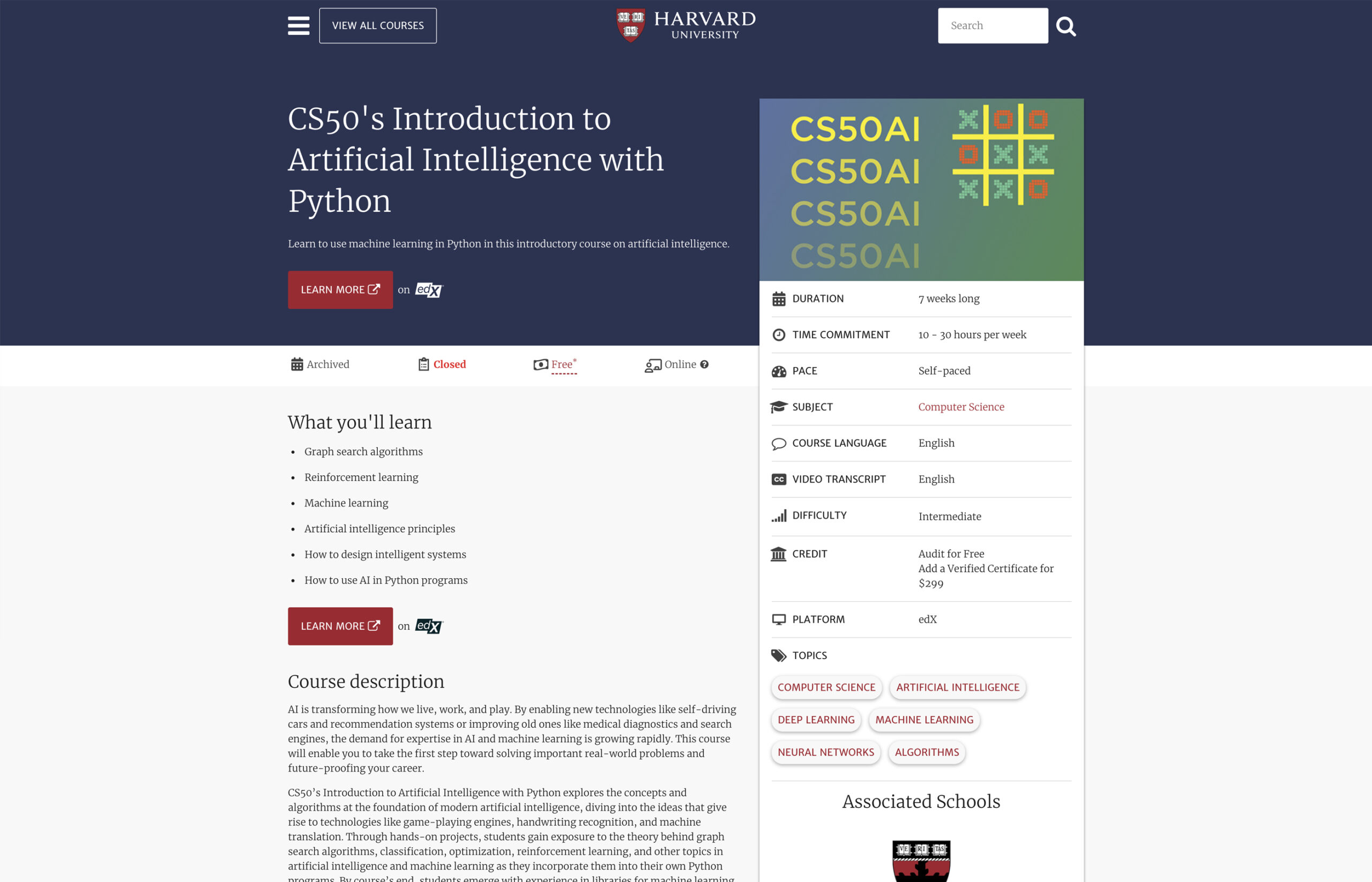 While the content is free to access, learners can choose to pay a small fee for a verified certificate. The course includes a series of lectures, hands-on projects, and problem sets that simulate real-world AI challenges. The final project allows learners to build an AI-based system from scratch.