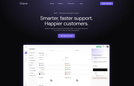 Dante AI is a no-code AI chatbot platform that makes it easy for businesses and individuals to build customized chatbots trained on their own data.