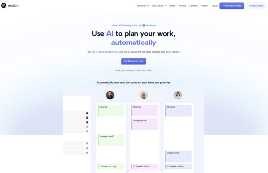 Motion is an AI-powered productivity assistant that acts like a smart planner, automatically managing your schedule so you don’t have to. Instead of manually rearranging tasks or struggling to fit meetings around your work, Motion dynamically builds and adjusts your day based on priorities, deadlines, and calendar events. It helps you protect focus time, avoid constant context-switching, and still keep up with meetings and project deadlines. For busy professionals or teams juggling multiple priorities, Motion feels like having a personal assistant who keeps everything organized and ensures nothing slips through the cracks.