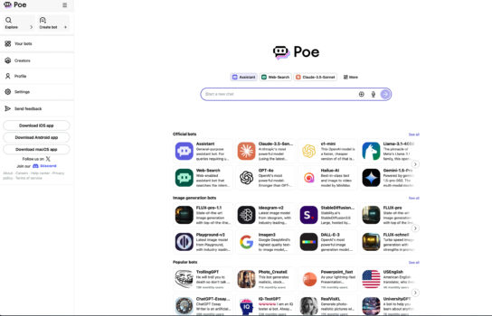 Getting started with Poe was effortless. The platform’s clean interface allowed us to jump right into conversations, selecting from a range of AI models tailored to different tasks. Whether we were asking quick factual questions, brainstorming creative ideas, or diving into deeper discussions on topics like science, philosophy, or even pop culture, Poe delivered responsive and varied interactions. The ability to switch between models in one place was a standout, letting us compare their strengths—like one model’s knack for detailed analysis versus another’s conversational flair—without needing multiple apps.