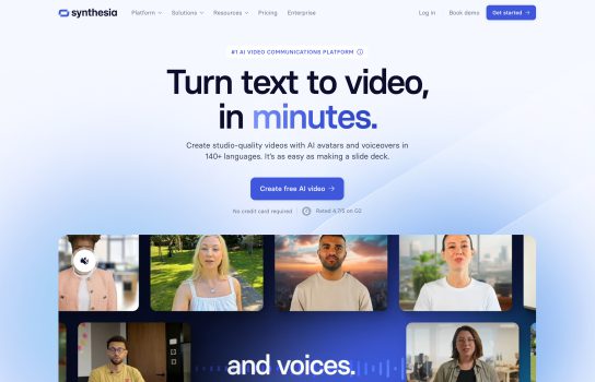Synthesia offers an innovative way to create video content, ideal for users and businesses needing fast, efficient video production. Using AI technology, it simplifies the process and supports multiple languages and customizable virtual avatars.Synthesia offers an innovative way to create video content, ideal for users and businesses needing fast, efficient video production. Using AI technology, it simplifies the process and supports multiple languages and customizable virtual avatars.